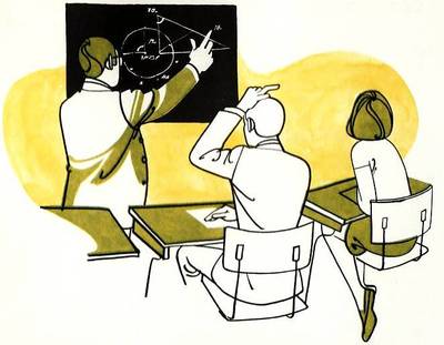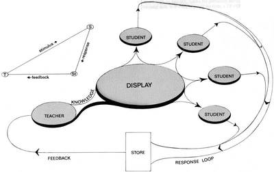 The teacher discuss the subject, conduct an experiment, explains a mathematical problem, etc. He then poses a question and visually presents up to four possible answers. Every student responds to this questions by depressing one of four "answer" buttons.