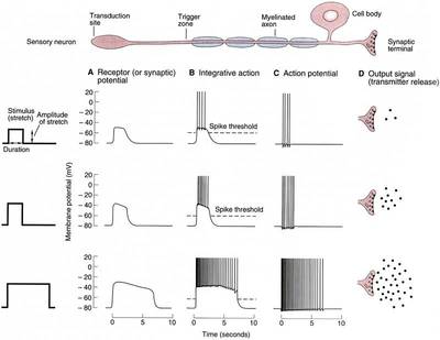 Special type of neurons are sensory neurons that are working as analogue to digital converters to convert analogue voltage value of the sensory device to digital value in form of pulses. Number of pulses per time unit defines the analogue value.